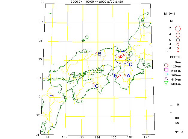 A.奈良県地方 1 10日18時55分 深さ60km M3.6 岡山から171km B.鳥取県西部 2 11日03時35分 深さ10km M2.9 岡山から77km C.高知県中部 3 12日12時01分 深さ50km M4.2 岡山から111km D.京都府北部・京都府南部 4 15日07時40分 深さ10km M3.0 岡山から175km 8 25日02時46分 深さ20km M3.1 岡山から174km 9 27日00時03分 深さ20km M4.3 岡山から154km 10 27日01時19分 深さ10km M3.2 岡山から154km 11 28日13時46分 深さ10km M3.2 岡山から154km 12 29日10時08分 深さ10km M3.0 岡山から146km 13 29日13時33分 深さ10km M2.7 岡山から146km E.和歌山県北部 5 17日08時28分 深さ10km M3.4 岡山から146km 6 20日06時11分 深さ10km M3.0 岡山から142km F.大分県西部 7 25日01時32分 深さ10km M2.8 岡山から300km (注意)アルファベットは、地図上の記号と一致し、番号は、スコア表の番号と一致する。