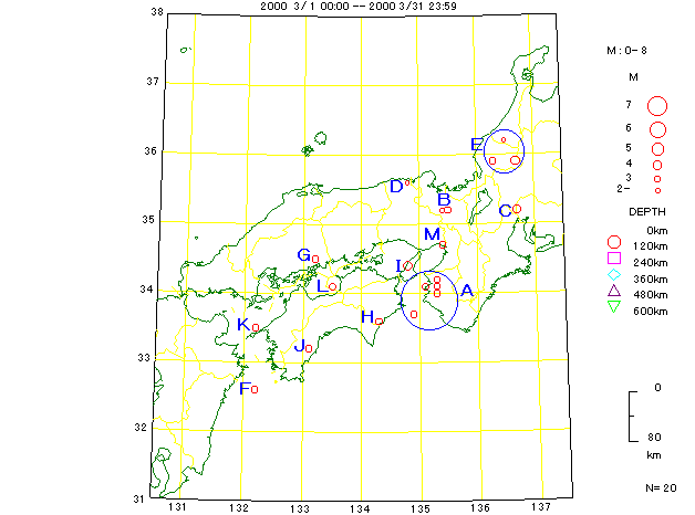 A.和歌山県北部・紀伊水道 1 01日05時11分 深さ10km M3.4 岡山から137km 4 03日17時15分 深さ50km M3.8 岡山から142km 6 07日22時00分 深さ10km M3.2 岡山から142km 11 10日16時35分 深さ10km M3.1 岡山から148km 12 11日22時53分 深さ10km M3.2 岡山から127km B.京都府南部 2 02日11時15分 深さ10km M2.8 岡山から146km 14 15日23時33分 深さ10km M3.4 岡山から154km C.愛知県西部 3 03日09時23分 深さ10km M4.0 岡山から257km D.兵庫県北部 5 06日09時55分 深さ10km M2.3 岡山から127km E.福井県嶺北地方・石川県加賀地方 7 07日23時25分 深さ10km M3.2 岡山から252km 10 10日14時35分 深さ0km M2.9 岡山から285km 18 24日23時00分 深さ10km M4.1 岡山から284km F.日向灘 8 08日12時15分 深さ30km M3.8 岡山から277km G.広島県南東部 9 09日20時21分 深さ20km M3.2 岡山から67km H.徳島県南部 13 12日08時22分 深さ50km M3.8 岡山から126km I.淡路島付近 15 18日11時08分 深さ10km M4.2 岡山から87km J.高知県西部 16 23日01時20分 深さ20km M3.6 岡山から180km K.伊予灘 17 23日06時50分 深さ50km M3.5 岡山から202km L.瀬戸内海中部 19 27日19時58分 深さ10km M3.2 岡山から284km M.兵庫県南東部 20 30日23時29分 深さ10km M3.3 岡山から135km (注意)アルファベットは、地図上の記号と一致し、番号は、スコア表の番号と一致する。